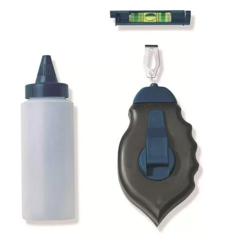 Include un recipient cu pulbere de creta albastra (115g) cat si o mini nivela.