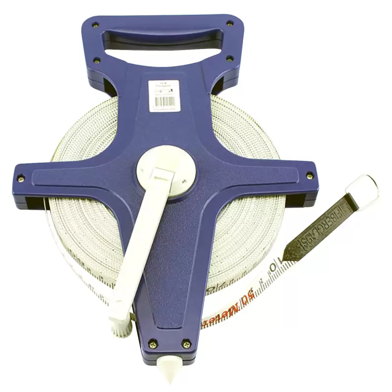 carcasa din plastic ABS antialunecare culori carcasa : albastru banda din fibra de sticla cu invelis de vinyl de culoare alba marcaj in sistem metric (mm, cm, m) grosimea bandei de aprox. 0.5 mm banda rezistenta la o forta de intindere de max. 10 kgf varf conic de fixare pe teren manivela pentru rularea benzii