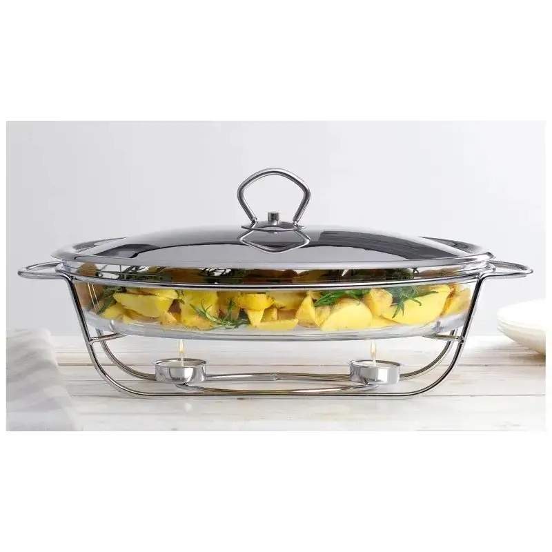 Vasul de incalzit 3L este fabricat din sticla termorezistenta si otel inoxidabil de cea mai buna calitate. Poate fi folosit atat in cuptorul cu microunde cat si in cuptor, indiferent de sursa de caldura folosita (gaz, electric). Se pot pregati alimentele direct in el, sa fie servit si apoi pastrat in acelasi vas deoarece sticla (doar sticla) rezista la temperaturi cuprinse intre -25 grade Celsius si +230 grade Celsius. Vasul are un capac din inox. Suportul inox are inclus un rezervor pentru o lumanare tip pastila (inclus 1 buc) pentru mentinerea calda a mancarii servite. Se recomanda pentru servirea supelor.